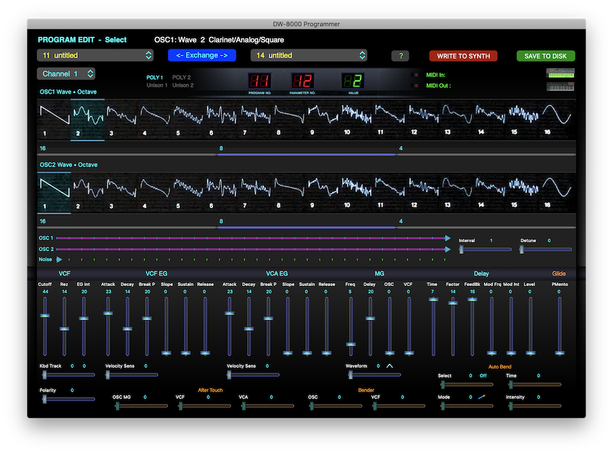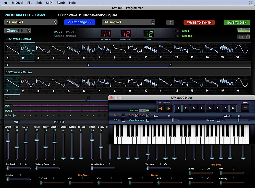 KORG DW-8000 or KORG EX-8000 -- DW-6000 support added as of v1.2, but DW 6000 support is untested due to lack of unit and non-response from Beta testers